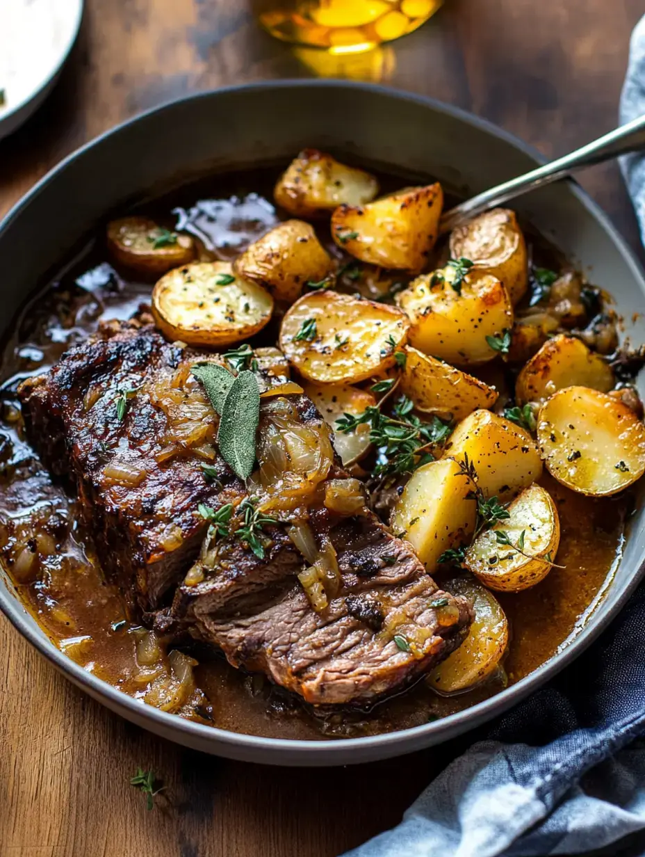 A flavorful beef roast cooked low and slow in apple cider and wine, paired with crispy potatoes flavored with sage and garlic butter.